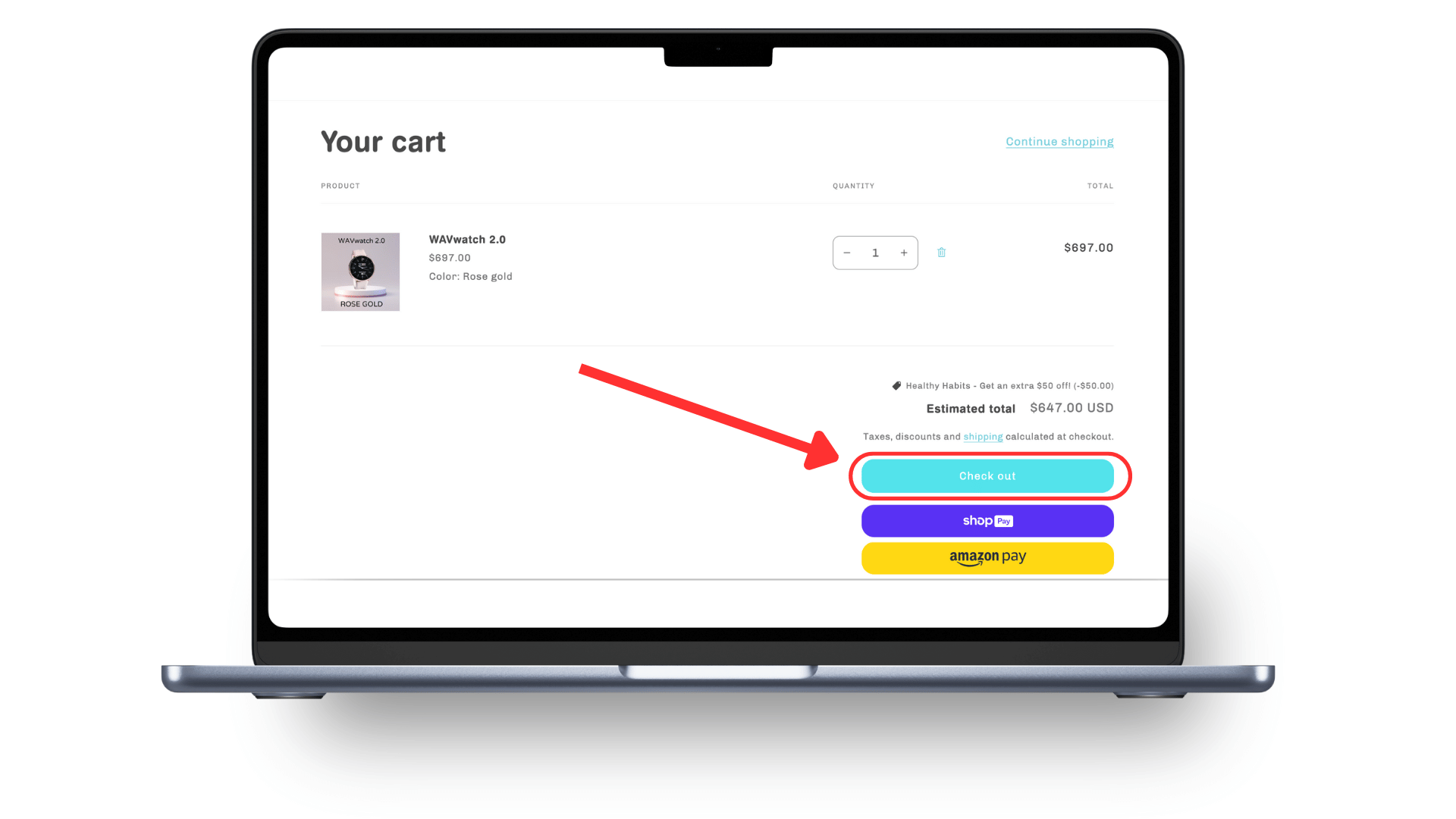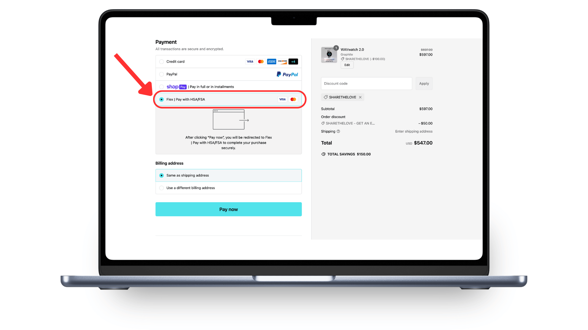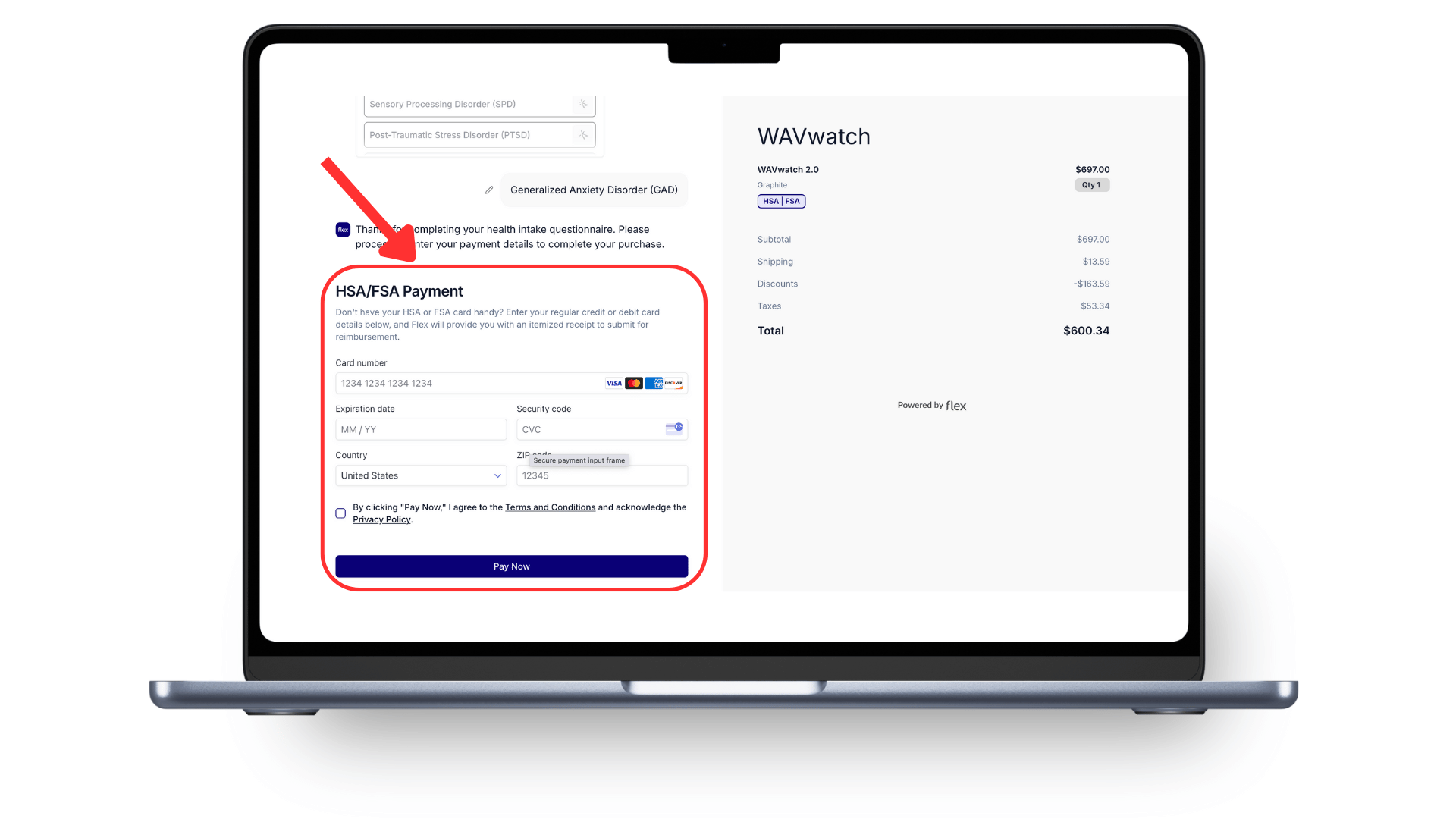 Instead of paying with a credit card, PayPal, or Shop Pay when purchasing your WAVwatch, select “Flex | Pay with HSA/FSA” to begin the approval process which allows qualified customers to pay with their HSA/FSA debit card. The click “Pay Now.”